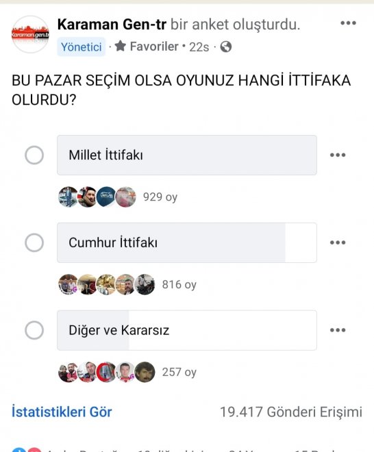Karaman’da sosyal medya da yaklaşık 5 bin kişinin katıldığı ankette AKP ve MHP kaybediyor.
