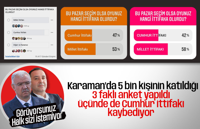 Karaman'ın ünlü sosyal medya fenomenleri Erdem Silay ve Ali Dağlı 3 farklı yerde anket düzenledi. 26 saat içerisinde 5 bin kişiden fazla kişinin katıldığı anketlerin üçünde de Cumhur ittifakının kaybettiği gözlendi.
