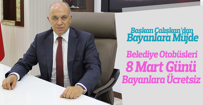 Belediye Başkanı Ertuğrul Çalışkan, 8 Mart Dünya Kadınlar Günü nedeniyle bu yıl da bayanların gün boyu belediye otobüslerinden ücretsiz istifade edebileceklerini söyledi. Başkan Çalışkan; “8 Mart Dünya Kadınlar Günü nedeniyle şehir içi ulaşımı sağlayan belediye otobüslerimiz, 8 Mart 2019 Cuma günü hanımlarımıza ücretsiz hizmet verecektir. Bu vesileyle bütün kadınlarımızın Dünya Kadınlar Günü'nü kutluyor, sağlıklı, huzurlu bir yaşam geçirmelerini diliyorum” dedi.