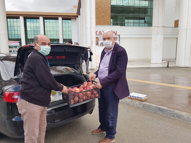 Tüm Dünya ve Ülkemizin zor zamanlardan geçtiği bu günlerde kendi aile ve hayatlarından fedakarlık göstererek canla başla çalışan sağlık çalışanlarımız ve çeşitli kurumlarda görev yapan vatandaşları ziyaretlerini sürdüren başkanlar Abidin Çağlayan ve Feyzullah Tunç, ilk önce Karaman Devlet Hastanesine giderek bütün hastane çalışanlarını ziyaret ederek onlara iftarlık dağıttılar. Herkesle tek tek ilgilenen başkanlar hal hatır sorarak Cumhurbaşkanımız Recep Tayyip Erdoğan’ın selamlarını ileterek teşekkür ettiler. Hastanenin ardından Valilik binasında hizmet veren ‘’Açık Kapı’’ birimini ziyaret eden başkanlar, şehir dışına çıkmak isteyen vatandaşlara seyahat belgesi veren çalışanları ziyaret ederek iftarlık dağıtıp teşekkürlerini ilettiler. Bu ziyaretten sonra Vefa Sosyal destek ofisi çalışanları ve 112 acil çalışanlarında ziyaret eden Başkanlar onlarla da tek tek ilgilenerek teşekkür ettiler.
