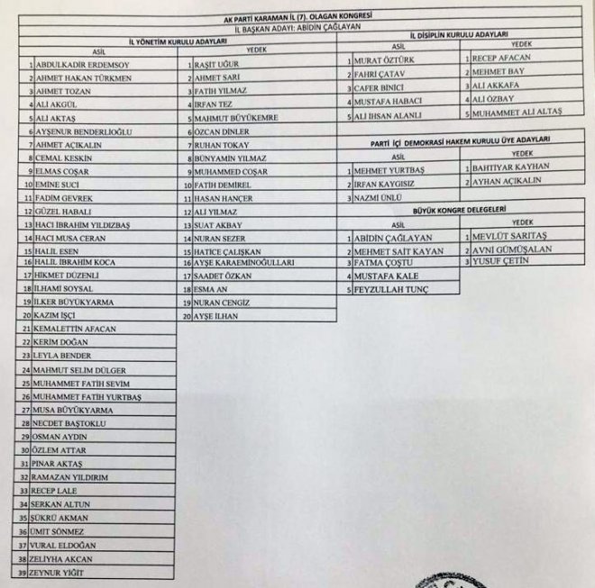 Kongreye tek liste giden Karaman Teşkilatı Eski Saadet Partisi ve Has Parti İl Başkanlığı yapan ve geçen sene AK Parti Genel Merkezi tarafından İl Başkanlığına atanan Noter Abidin Çağlayan’ı tekrar başkan seçti.