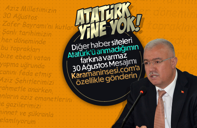 100. Yılını kutladığımız 30 Ağustos Zafer Bayramı nedeniyle siyasetçiler kutlama mesajı yayınlarken, AKP Karaman İl Başkanı Abidin Çağlayan, 30 Ağustos'un kahramanı Mustafa Kemal Atatürk'ü anmadan bir mesaj yayınlaması dikkatlerden kaçmadı.