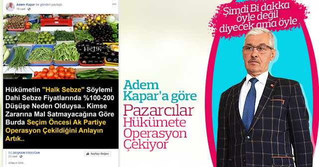 Karaman İl Genel Meclis Başkanı Adem Kapar’ın facebook’ta ki paylaşımına kendi köylüleri büyük tepki gösterdi. Pazar ürünlerinin pahalı olmasının Hükümete yapılan bir operasyon olduğunu iddia eden Adem Kapar’ın paylaşımına köylüleri “ Adem bey bilmeden mi konuşuyor, yoksa kasıtlı mı yapıyor.” Diyerek tepki gösterdiler.