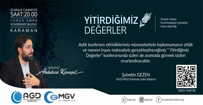 Anadolu Gençlik Derneği olarak Türkiye’nin 81 il ve yüzlerce ilçesinde teşkilatlanıp geleceğimizin teminatı gençlerimizin peygamber ahlakı olan Kur’an ile ahlaklanmaları için gece gündüz çalışıyoruz. Sadece bulunduğumuz mahalle, şehir veya ülkemiz değil, bütün insanlığın kurtuluşu için çaba harcıyoruz. Bu minvalde aile ve toplum yapımızın ahlaki yönden hızla dejenere edildiği günümüzde, milli ve manevi değerlerimiz çerçevesinde çözüm yollarının anlatılacağı konferansa Karamanda buluna tüm halkımız davetlidir. Sosyal medya, Aile, Kurumsallaşan günahlar ve Dava adamlığı konularında sorunlar ve çözümlerin anlatılacağı program 1 Aralık Cumartesi saat 20.00’da Yunus Emre Konferans Salonunda gerçekleştirilecektir. Günümüz sorunlarına yönelik önemli tespitleri ve çarpıcı yazılarıyla dikkat çeken ilahiyatçı yazar Abdulaziz Kıranşal’ın sunumlarıyla gerçekleşecek olan konfaransa bütün aile ve özellikle geleceğimizin teminatı gençlerimizi bekliyoruz.