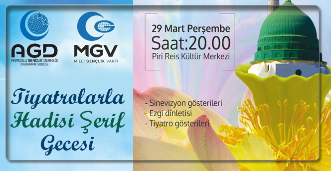 Karaman Anadolu Gençlik Derneği Liseler ve İmam Hatipler Komisyonu tarafından 29 Mart 2018 Perşembe akşamı 20.00 de Piri Reis Kültür Merkezinde “Tiyatrolarla Hadis-i Şerif Gecesi” programı düzenlenecek. Anadolu Gençlik DerneğiKaraman Şubesi tarafından yapılan açıklamadaYüce Kitabımızda Ahzap suresinde “Andolsun ki, Resulullah, sizin için, Allah'a ve ahiret gününe kavuşmayı umanlar ve Allah'ı çok zikredenler için güzel bir örnektir.” Ayet-i Kerimesi gereğince Peygamber (sav) hadis-i Şeriflerini toplumumuza örnek kılmak gayesiyle tertip edilen programımızda Ezgi ve şiir dinletisi, sinevizyon gösterileri, minik öğrencilerden Hadis-i Şerif sunumları ve 4 oyun şeklinde düzenlenen tiyatrolarla yine önemli konularda Hadis-i Şerifler sunulacaktır. Programımıza tüm Karaman halkımız davetlidir… denildi.