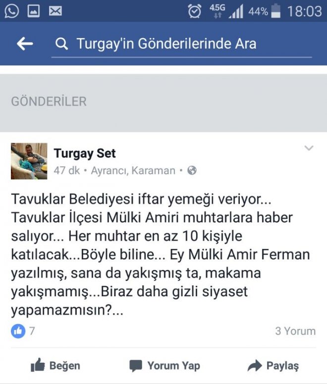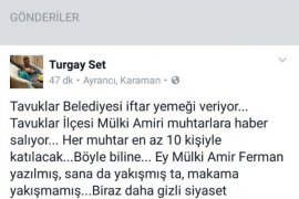 Karaman Valisi Süleyman Tapsız, Milletvekilleri ve protokol üyelerinin katıldığı iftar yemeğine gitmeyen Ak Partili Ayrancı ilçe Başkanı Turgay Sert, Facebook sayfasında "Tavuklar Belediyesi iftar yemeği veriyor... Tavuklar ilçesi Mülki Amiri muhtarlara haber salıyor... Her muhtar en az 10 kişiyle katılacak... Böyle biline... Ey Mülki Amir Ferman yazılmış, sana da yakışmış ta, makama yakışmamış... Biraz daha gizli siyaset yapamazmısın?..."