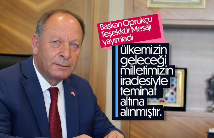 Başkan Oprukçu mesajında: "Aziz Milletim, Kıymetli Hemşerilerim; 28 Mayıs'ta şükürler olsun ki istikrarın devamıyla güvenliğimiz, huzur ortamımız, istiklal ve istikbal hedeflerimiz, kısacası ülkemizin geleceği milletimizin iradesiyle teminat altına alınmıştır.