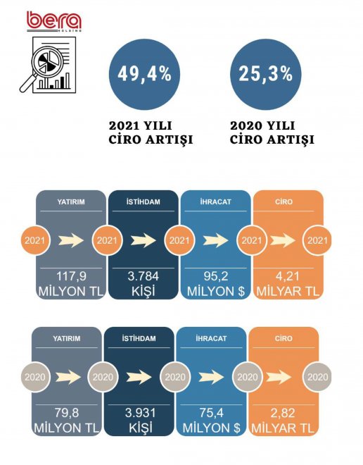 2021 faaliyet dönemi finansal tablolarını açıklayan BERA Holding, küresel ve ulusal düzeydeki olumsuzluklara rağmen 2021 faaliyet dönemini başarılı bir performansla tamamlayarak satış hasılatını %50 artışla 4 milyar 217 milyon 184 bin 173 liraya çıkardı. Dönem net karı ise %212 oranında artarak 746.546.258 TL olarak gerçekleşti.