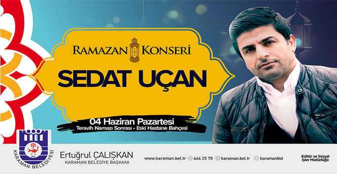 Karaman Belediyesi Kültür ve Sosyal İşler Müdürlüğü tarafından haftanın dört günü düzenlenen iftar sofraları ve Ramazan etkinlikleri sayesinde vatandaşlarımız dolu dolu bir Ramazan Ayı yaşıyor. Sevilen sanatçıların Karaman halkıyla buluştuğu konserlerde bu akşam (4 Haziran 2018 Pazartesi) da ünlü sanatçı Sedat Uçan sahne alacak.