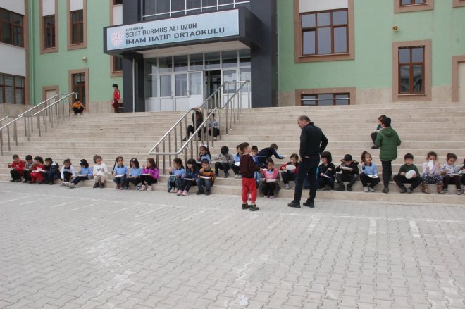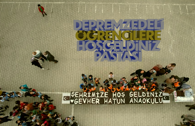Karaman Gevher Hatun Anaokulu öğrencileri, anneleri ile birlikte evlerinde yaptıkları yaş pastaları ilk ve ortaokul olmak üzere 500’e yakın depremzede öğrencinin eğitim gördüğü Şehit Durmuş Ali Uzun İmam Hatip Ortaokuluna götürdü. Burada pastalar bahçeye konan masalarda birleştirilerek üzerine ‘şehrimize hoş geldiniz’ yazısı yazıldı. Daha sonra hazırlanan pasta anaokulu öğretmenleri tarafından teneffüse çıkan depremzede öğrencilere ikram edildi. Öğrenciler aldıkları pastayı afiyetle yedi.