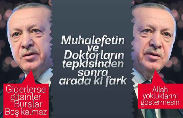 Erdoğan, burada muhtarlara hitaben yaptığı konuşmada yurt dışına giden hekimleri eleştirerek “Varsın gidiyorlarsa gitsinler, bizler de üniversiteleri yeni bitiren doktorlarımızı buralarda istihdam eder buralarda yola devam ederiz” ifadelerini kullanmıştı…