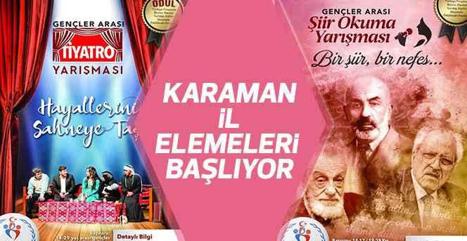 Gençlik ve Spor Bakanlığı tarafından gençlerin geleneksel sanata sahip çıkan bireyler olarak yetişmesi amacıyla düzenlendiği Türk Müziği, Şiir Okuma, Tiyatro ve Bilgi Yarışmaları’nın Karaman il elemeleri şiir okuma ve tiyatro kategorisinde düzenlenecek yarışmalarla başlıyor.