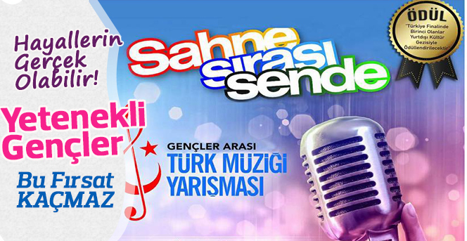 ‘Sahne Sırası Sende’ sloganıyla bu yıl dördüncü kez düzenlenen Türk Müziği yarışması 18-23/24-29 Solo Erkek Ses, Solo Kız Ses ve Özgün Yorumlama (cover) dallarında düzenlenecek. Bin yıllık kültürümüzün sahneye taşınacağı yarışmada gençler Türk Halk, Türk Sanat ve Geleneksel Türk Müziği’nden eserleri seslendirecek. Özgün Yorumlama kategorisinde ise gençler geleneksel müzik argümanları ile yapılmış eserleri, popüler kültür ürünü olan müzik argümanları ile sözlü olarak yeniden icra edecek.
