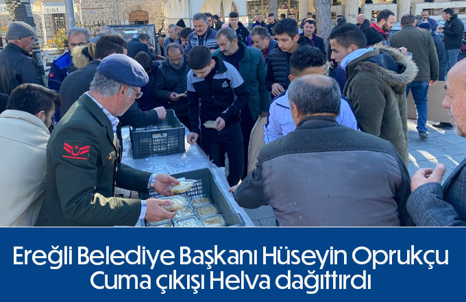 Ereğli Belediye Başkanı Hüseyin Oprukçu Cuma namazı sonrasında Ulu Cami önü Devlet Bahçeli Meydanı’nda geçtiğimiz günlerde vefat eden baldızı Fadime Öz için vatandaşlara helva ikramında bulundu. Bir kez daha merhumeye Allah’tan rahmet, ailesine ve sevenlerine başsağlığı dileriz.