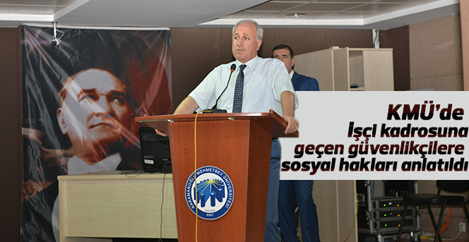 Eğitimin açılış konuşmasını yapan KMÜ Genel Sekreteri Ahmet Tüfekci, güvenlikçilerin üniversite içerisinde üstlendikleri faaliyetlerden bahsederek, “Güvenlik olmazsa eğitim olmaz. Sizlerin yaptığı işler üniversitemiz için son derece önemli. Yerleşkemizin güvenliği sizlere ait ve sizin uygulamalarınız hepimizi ilgilendiriyor. Özellikle mesai saatleri dışında bu alanda tüm yetki sizin elinizde. İşinizi yaparken son derece duyarlı ve dikkatli davranmalısınız. Çünkü eylem ve kararlarınızın doğuracağı sonuçlar üniversitemiz için bağlayıcı nitelik taşımaktadır. Ayrıca üniversite ile ilgili ilk intiba güvenlik personelinden başlar. Sizin göstereceğiniz nezaket, saygı ve iyi tutum o yüzden de önemlidir. Her biriniz bizim için çok değerlisiniz. Yeni statünüzün yanında zamanla diğer haklarınızı da almanız konusunda kurum olarak arkanızdayız. KMÜ ailesi olarak her zaman birlikte hareket edeceğiz. Kanun hükmünde kararname ile sürekli işçi kadrosuna geçen personelimize yeni kadrolarının hayırlı olmasını diliyor, şimdiden hepinizin bayramı kutluyorum. Sağlık ve mutlulukla kalın” dedi.