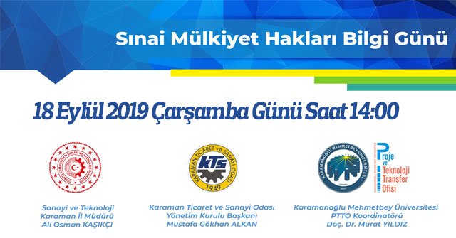 Karaman Sanayi ve Teknoloji İl Müdürlüğü, Karamanoğlu Mehmetbey Üniversitesi PTTO Koordinatörlüğü ve Karaman Ticaret ve Sanayi Odası işbirliğinde Odamız ev sahipliğinde 6769 Sayılı Sınai Mülkiyet Kanunu kapsamında “Sınai Mülkiyet Hakları Bilgi Günü” 18 Eylül 2019 Çarşamba günü saat 14:00 de Karaman Ticaret ve Sanayi Odası Toplantı Salonunda düzenlenecektir.