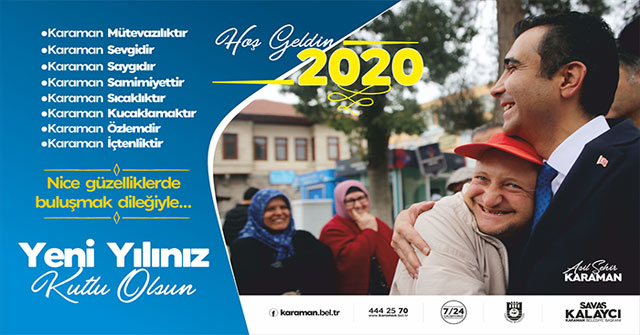 Karaman Belediye Başkanı Savaş KALAYCI yayınladığı mesajda; “2020 yılının mutlulukların arttığı, umutların tazelendiği, duaların kabul gördüğü ve hayallerin gerçeğe dönüştüğü bir yıl olmasını temenni ediyorum. Feraseti, metaneti, sabrı ve fedakârlığı ile çok sıkıntılı ve zorlu süreçleri geride bırakan milletimizin yeni yılla birlikte feraha ve huzura kavuşması en büyük temennimizdir.