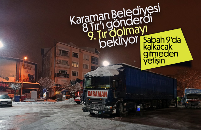 Karaman Belediyesi tarafından Deprem Bölgesine gönderilmek üzere Aktekke Meydanı’nda ki yardım kampanyasında; 8 Tır yardım toplanarak afet bölgesine gönderildi. Karaman Belediyesi yardım çalışmasına ara vermeden devam ediyor. Yardım malzemesi getirmek isteyen vatandaşlarımız için 9. Tır tamamlanmak üzere Aktekke Meydanında bekliyor. Tır tamamen dolduktan sonra afet bölgesine yola çıkılacak.