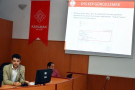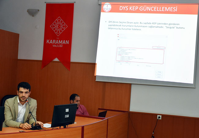 Kayıtlı Elektronik Posta (KEP) sisteminin kullanımına ilişkin bilgi vermek amacıyla İl Milli Eğitim Müdürlüğü personeliyle yapılan toplantıda konuşan İl Milli Eğitim Müdürü Mevlüt Kuntoğlu KEP sisteminin iller düzeyinde ilk kez Karaman’da uygulamaya konulduğunun altını çizerek “Yeni sistemle, daha evvel başarıyla uygulanan Doküman Yönetim Sistemi (DYS)’nin geliştirilerek iş ve işlemlerin kısa sürede gerçekleştirilebilmesi için KEP ile Müdürlüğümüze bağlı kurumların dışındaki resmi ve özel kurumlarla da yazışmalar yapılabilecek. Böylelikle sisteme geçen kurumlara elden hiçbir yazı gönderilmeyecek. Saniyelerin bile önemli olduğu çağımızda zamanın daha verimli kullanılması, kağıt sarfiyatının önüne geçilerek evrak takibi ve arşivleme gibi kolaylıklarla, çalışmalar daha hızlı yürütülecek. Bakanlıklar dışında Türkiye genelinde ilk kez ilimizde uygulamaya konulacak çalışmanın hayırlı olmasını diliyorum.” dedi.