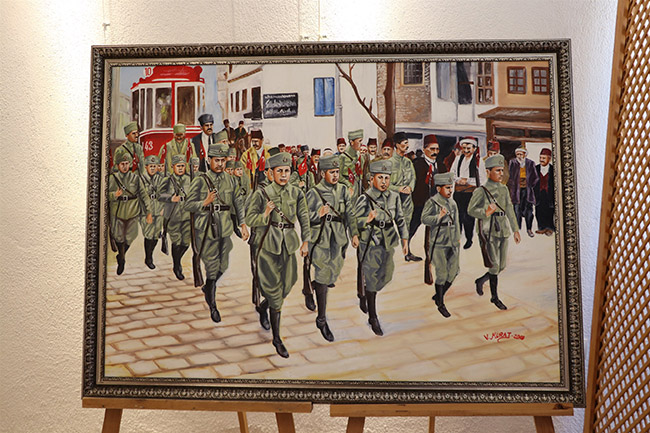 Türkiye Cumhuriyeti’nin kurucusu Gazi Mustafa Kemal Atatürk’ü, silah arkadaşlarını, Milli Mücadele’nin isimsiz kahramanları olan Anadolu insanını bir kez daha saygı ve minnetle anmak üzere hazırlanan sergi; kaligrafi, Kaat-ı Sanatı, yağlı boya, karakalem ve karikatür gibi 30 eserlerden oluşuyor.