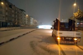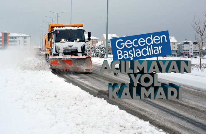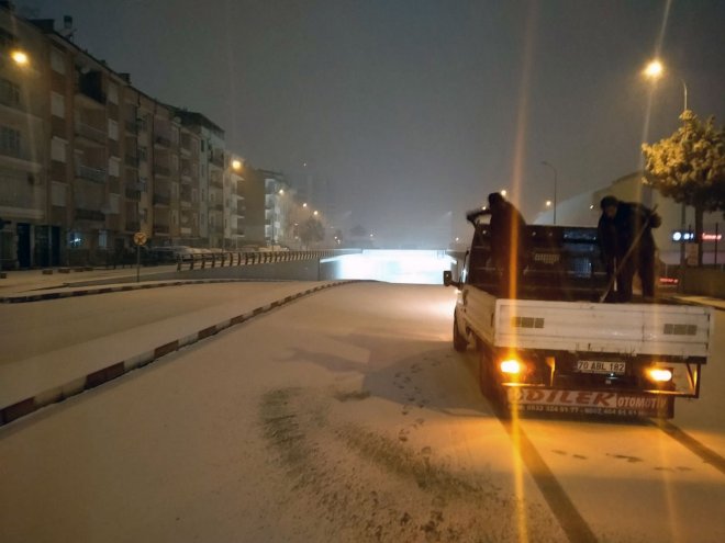 Karaman Belediyesi, gece saatlerinde başlayan kar yağışı ile birlikte ekiplerini seferber ederek yol ve kaldırımların açık kalması için yoğun bir çalışma başlattı.