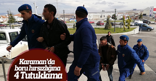 Edinilen bilgiye göre, İl Jandarma Komutanlığına bağlı ekipler, merkeze bağlı Kızık köyünde bir çiftçiye ait tarladaki sulama borularının bazı kişilerce kamyonete yüklendiği yönünde ihbar alması üzerine bölgeye gitti. Tarlaya varan ekipler, M.N., S.N., M.I., R.Ü. ve M.N.’yi kamyonete boruları yüklerken yakalayarak gözaltına aldı. Jandarmada ifade işlemleri tamamlandıktan sonra hırsızlık iddiasıyla mahkemeye sevk edilen şüphelilerden M.N., S.N. M.N., ve M.I., tutuklanarak Karaman M Tipi Kapalı Cezaevine gönderilirken, şüphelilerden R.Ü. ise adli kontrol şartıyla serbest bırakıldı.