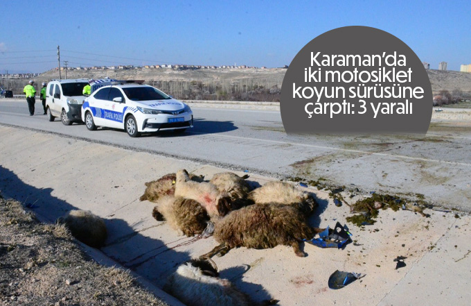 Kaza, saat 16.40 sıralarında Karaman-Mersin Karayolunun 3’ncü kilometresinde yaşandı. Edinilen bilgiye göre, aynı istikamette seyreden E.U. idaresindeki 70 ABN 622 plakalı motosiklet ile H.Y. yönetimindeki 70 ABM 796 plakalı motosiklet yola çıkan koyun sürüsüne çarptı. Kazada sürücülerden H.Y. ile motosikletlerde yolcu olarak bulunan Y.E. ve A.K. yaralanırken, 11 koyun da telef oldu. Yaralılar olay yerine gelen ambulanslarla Karaman Eğitim ve Araştırma Hastanesi'ne kaldırıldı. Tedavi altına alınan yaralılardan A.K’nin sağlık durumunun ağır olduğu öğrenilirken, kazayla ilgili soruşturma başlatıldı.