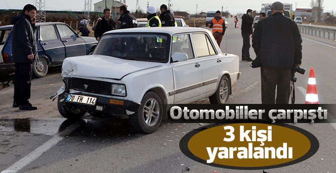 Kaza, sabah saat 09.00 sıralarında Karaman-Konya karayolunun 5. kilometresinde meydana geldi. Alınan bilgiye göre, Mehmet Emin B. (64) yönetimindeki 70 DC 599 plakalı otomobil ile Süleyman S. (38) idaresindeki 70 FH 114 plakalı otomobil sürücülerin dikkatsizliği sonucu çarpıştı. Kazada, 70 DC 599 plakalı aracın sürücüsü Emin B. ile aynı araçta yolcu olarak bulunan Mustafa D. (35) ve Ulviye B. (33) yaralandı. Yaralılar olay yerine çağrılan ambulansla kaldırıldıkları Karaman Devlet Hastanesinde tedavi altına alındı. Yaralıların sağlık durumlarının iyi olduğu öğrenildi.
