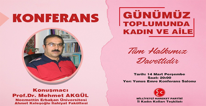 “Günümüz Toplumunda Kadın ve Aile” konusunda düzenlenecek olan ve Necmettin Erbakan Üniversitesi Ahmet Keleşoğlu İlahiyat Fakültesi Öğretim Üyesi Prof. Dr. Mehmet AKGÜL’ün konuşmacı olarak katılacağı konferansa tüm halkımız davet edildi.