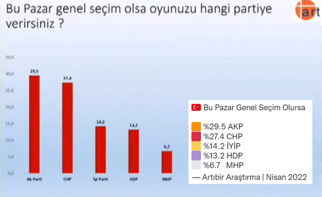 Artıbir Araştırma’nın son seçim anketinde vatandaşlara “Bu Pazar seçim olsa oyunuzu hangi partiye verirsiniz? sorusunu sordu. Bu ankere göre Meclis’te grubu bulunan partilerden AK Parti yüzde 29.5, CHP yüzde 27.4, İYİ Parti yüzde 14.2, HDP yüzde 13.2 oy oranında olduğu ortaya çıkarken MHP’nin ise yüzde 6.7 oya sahip olduğu belirtildi.