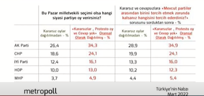 Metropoll Araştırma’nın mart ayında gerçekleştirdiği son seçim anketinde de MHP’nin yüzde 7’nin altında kalarak yüzde 4.9 oy oranına sahip olduğu görülmüş ve kararsızlar dağıtılmadan ise %3,7 ye geriledi.