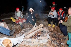 Karaman’ın Ermenek ilçesinde bulunan Zeyve Pazarı'ndaki bungalov evlerden oluşan tatil köyüne ilgi gösteren Rus turistler, kamp ateşinde eğlenip fırında kendi pidelerini pişiriyor.