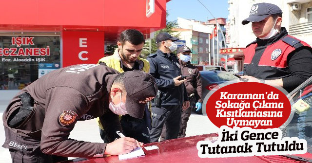 Karaman'da sokağa çıkma kısıtlamasına uymayan 20 yaş altı iki gence, polis tarafından tutanak tutuldu. Yapılan işlemlerin ardından gençler çağrılan polis aracıyla evlerine götürülürken, ikinci kez sokağa çıkma kısıtlamasına uyulmaması halinde gençlere cezai işlem uygulanacağı belirtildi.