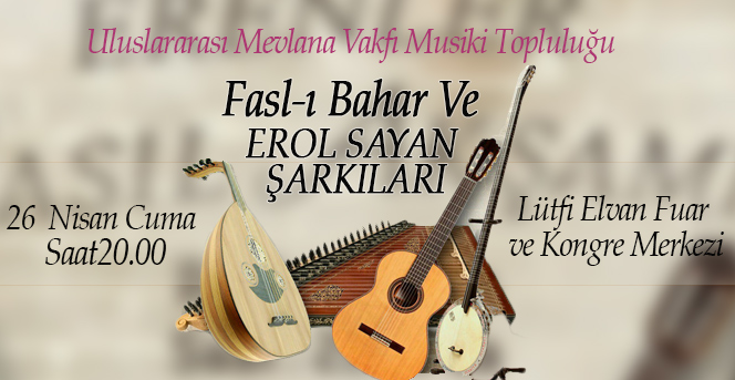 26 Nisan 2019 Cuma günü Lütfi Elvan Fuar ve Kongre Merkezi’nde, Uluslararası Mevlana Vakfı Musiki Topluluğu tarafından “Fasl-ı Bahar ve Erol Sayan Şarkıları” isimli bir konser verilecek. Ücretsiz düzenlenen konserde Uluslararası Mevlana Vakfı korosu, dillerden düşmeyen en güzel fasıl eserlerini seslendirecek.