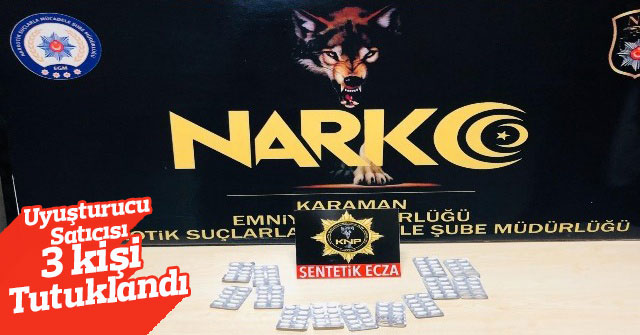 Edinilen bilgiye göre, Karaman İl Emniyet Müdürlüğüne bağlı Narkotik Suçlarla Mücadele Şubesi ekipleri, M.B., M.Ö. ve Ö.Ö. isimli şahısların uyuşturucu ticareti yaptığı yönünde duyum alması üzerine çalışma başlattı. Ekipler yaptıkları çalışma sonucunda 3 şüpheliyi gözaltına alırken, 119 adet uyuşturucu hap ele geçirdi. Emniyette işlemleri tamamlandıktan sonra adliyeye sevk edilen zanlılar, çıkarıldıkları mahkemece tutuklanarak Karaman M Tipi Kapalı Cezaevi'ne konuldu.