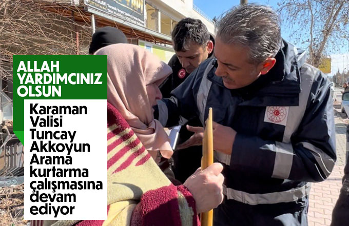 Karaman Valisi Tuncay Akkoyun Kahramanmaraş’ın Türkoğlu ilçesinde arama-kurtarma ve yardım çalışmaları devam ediyor.
