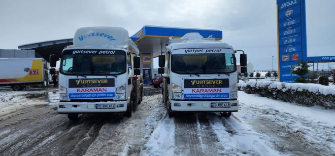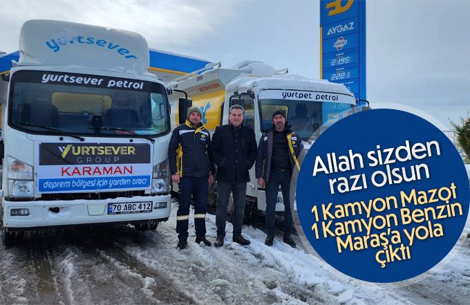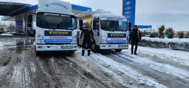 Karaman'ın en büyük akaryakıt firması olan Yurtsever Grup iki kamyon akaryakıtı Kahramanmaraş'a gönderiyor. Firma Müdürü Murat Gülşen; " Allah Devletimize ve Milletimize yardım etsin. Gün birlik günü ve bugün kenetlenme günüdür. Bildiğiniz gibi Sayın Valimiz Tuncay Akkoyun şuan da KahramanMaraş'ta görevlendirildi. Bizde 1 kamyon Mazot, 1 kamyon da Benzin olmak üzere iki kamyon akaryakıtı sayın Valimizin olduğu bölgeye gönderiyoruz. Bu vesile ile hayatını kaybedenler Cenab-ı Allah'tan rahmet diliyor yaralılara acil şifalar dilerken, şuan da göçük altında kurtarılmayı bekleyen vatandaşlarımıza yüce Rabbimden yardım diliyorum." dedi.