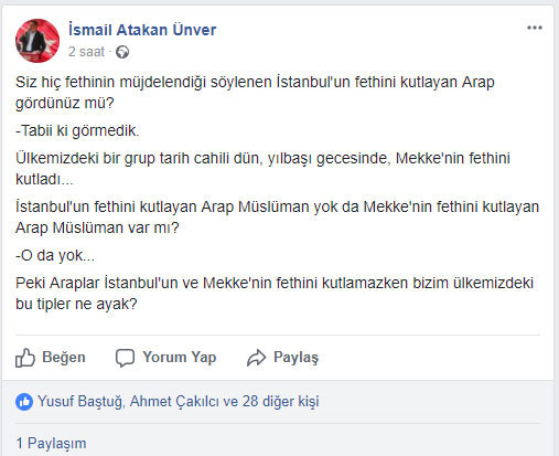 Yabancıların Yılbaşı gecesini daha önemli gören Atakan Ünver, Müslümanların İlk ve en büyük fethi olan Mekke'nin fethini de kafatasçılık yaparak "Arapların Fethi" olarak değerlendirdi.